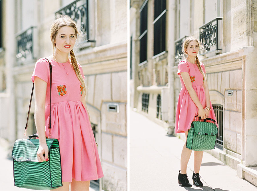 Elisa's green bag adds a lovely springy color to this look while her boots ground everything while also making things a little more mature and grown up.