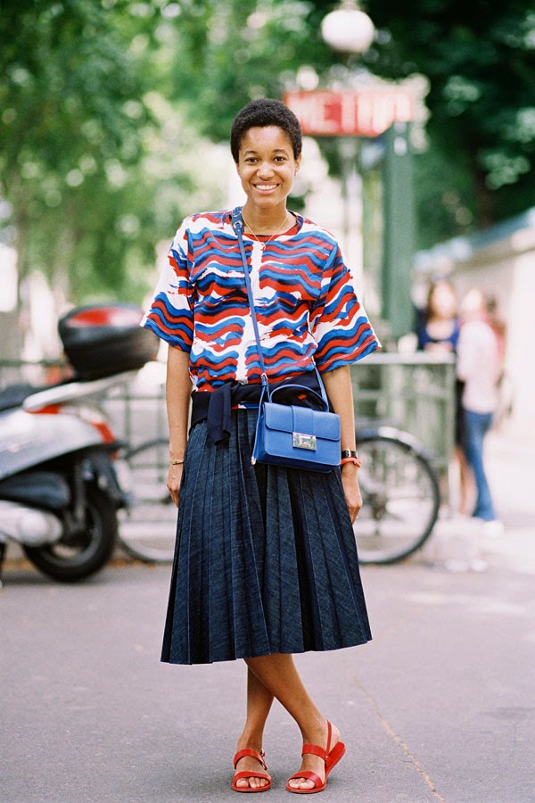 Such a great look on Tamu. Love everything about her outfit especially that pleated denim skirt (even though she was freezing in it! Paris was unseasonably cold and rainy during couture this season....which is why Lee, Tamu and I went to lunch at Le Castiglione instead of shooting one day :)).