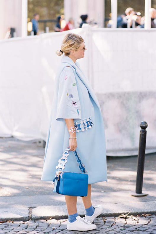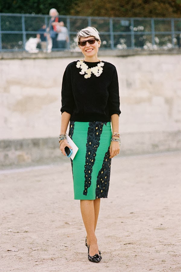 The fabulous Elisa and her brilliant way of putting together different colours, patterns and fabrics. A new way to wear a classic Breton stripe tee? Slip it under a sheer bomber jacket and wear with a denim skirt.