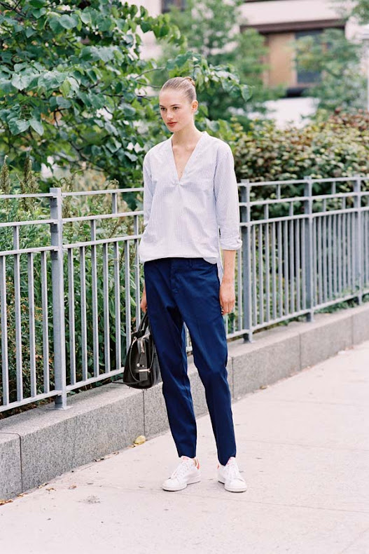 The beauty of simplicity: a fresh tunic top + tapered pants + pristine white sneakers (and beautiful hair and make-up!).