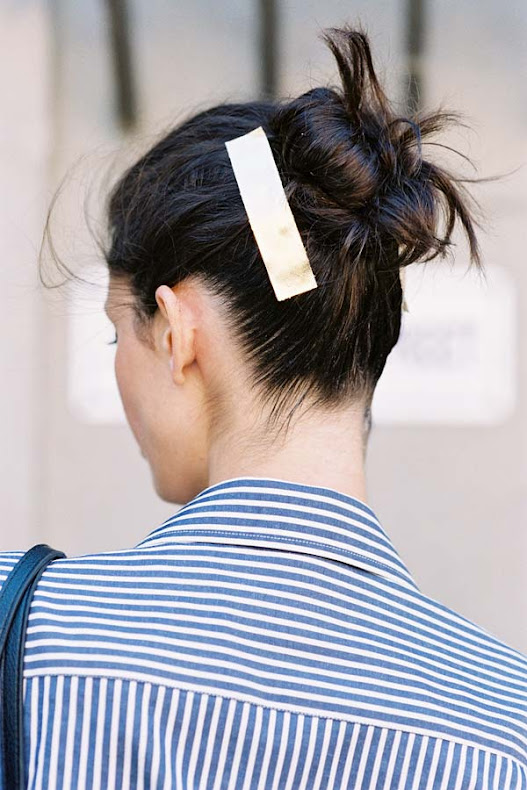 I guess this is sort of duct tape for hair but you could do something similar with a hairclip/barrette. A pretty vintage clip would look fab for evening with a messy hair bun.