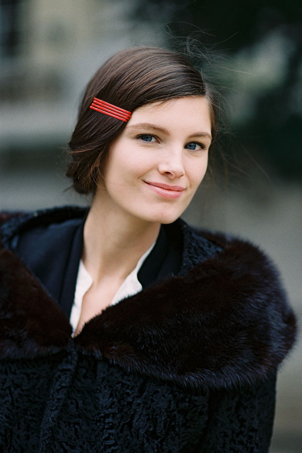 One of the beauty looks I really loved from the Paris shows was the side clip/barrette reminiscent of Margot Tenenbaum (played by Gwyneth Paltrow) in Wes Anderson's The Royal Tenenbaums. Such a cute, fun look - Hanneli wore it brilliantly in her shoulder-length layered hair and at Cacharel, the models had either scarlet red or ice - blue clips (not sure if they were hand painted bobby pins?) tucked into their side-parted twisted up (but down-low) do's.