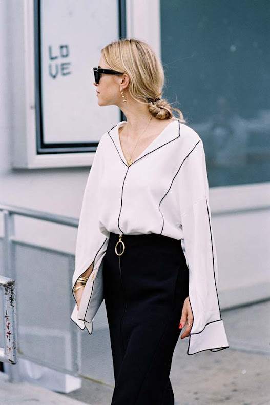 Bell-sleeve blouse with slits- Zeus + Dione Attic metallic striped blouse, Derek Lam Bell-sleeve blouse, Derek Lam bell-sleeve shirt in stripe, FRS White Flare Sleeve blouse, or Derek Lam colorblock tie-front tunic